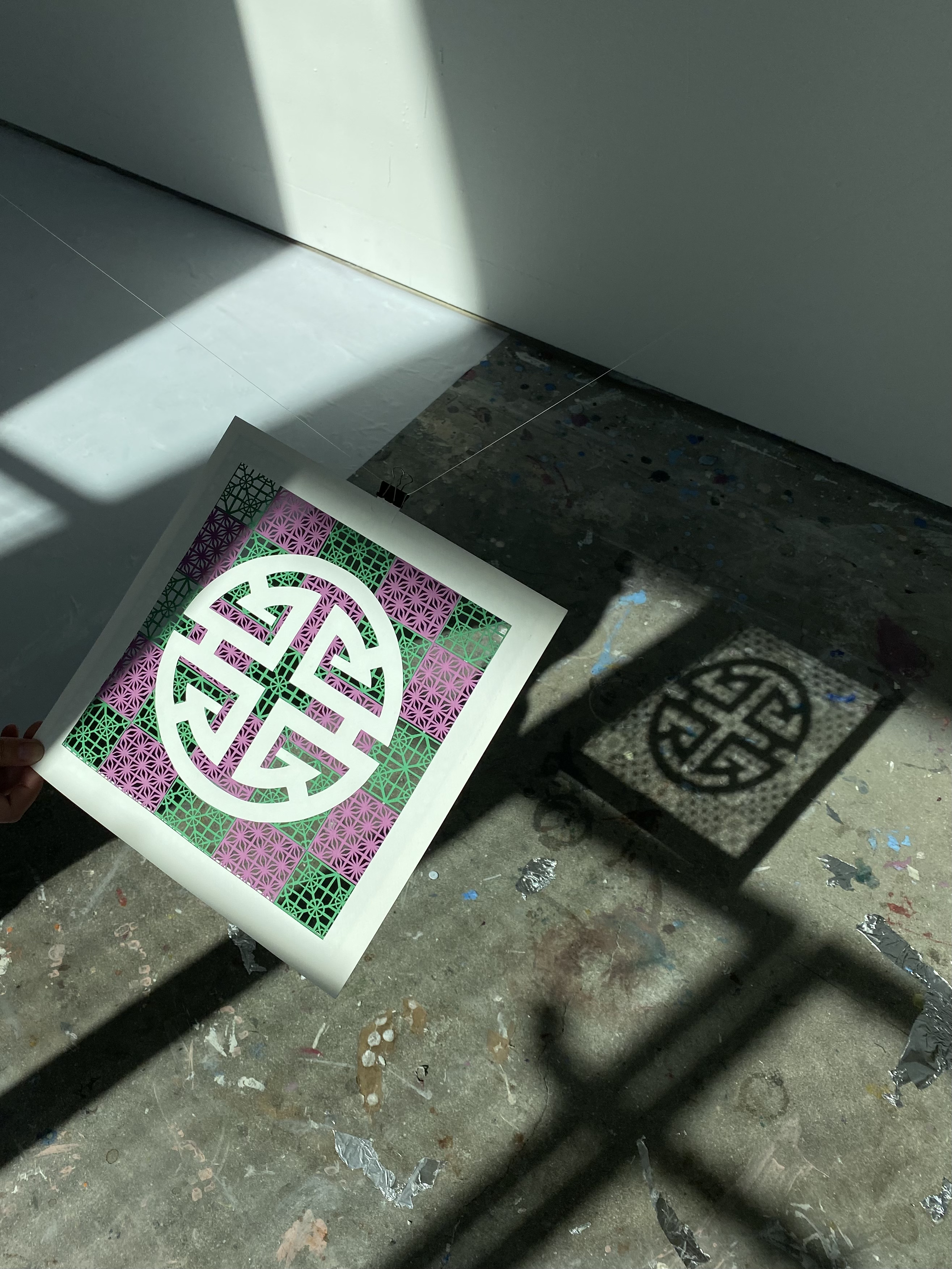 As extended to her previous “Wufufu” work, the Chinese words, commonly used within icon forms, such as joy, and wealth were directly placed on top of the grid.